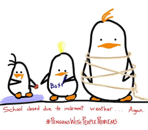 Lots of people get to enjoy Mary Laura’s sense of humor on her blog I Miss You When I Blink, which features her “on deadline, off topic” writing, including tips for ladypersons, interpretations of fashion ads, and our friends the Random Penguins, who have a book coming out. (A book about them. Not by them, by Mary Laura. To the best of my knowledge, penguins can’t write.)